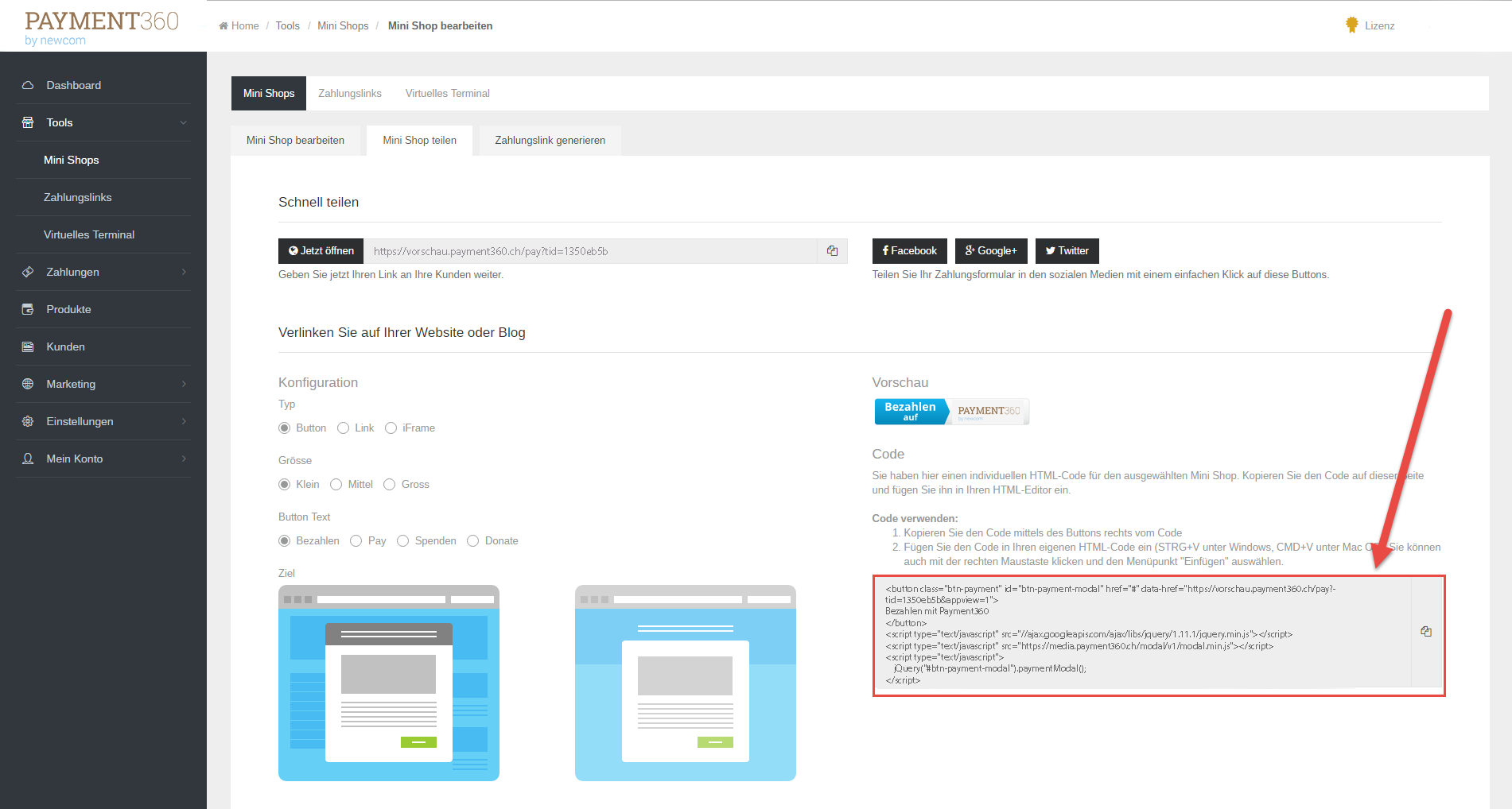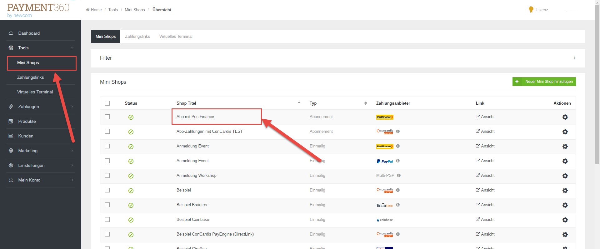 Melden Sie sich in Ihrer Payment360 Administrationsoberfläche an: IHR-SHOP.payment360.ch/cadmin.