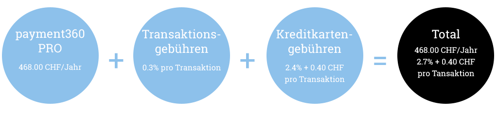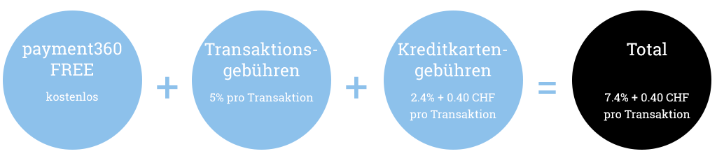 Zahlungen mit Payment360 werden mit unserem Kreditkarten-Acquirer durchgeführt. Dabei fallen folgende Gebühren an. Diese liegen in der Schweiz bei 2.4% + CHF 0.40.- pro erfolgreicher Transaktion.