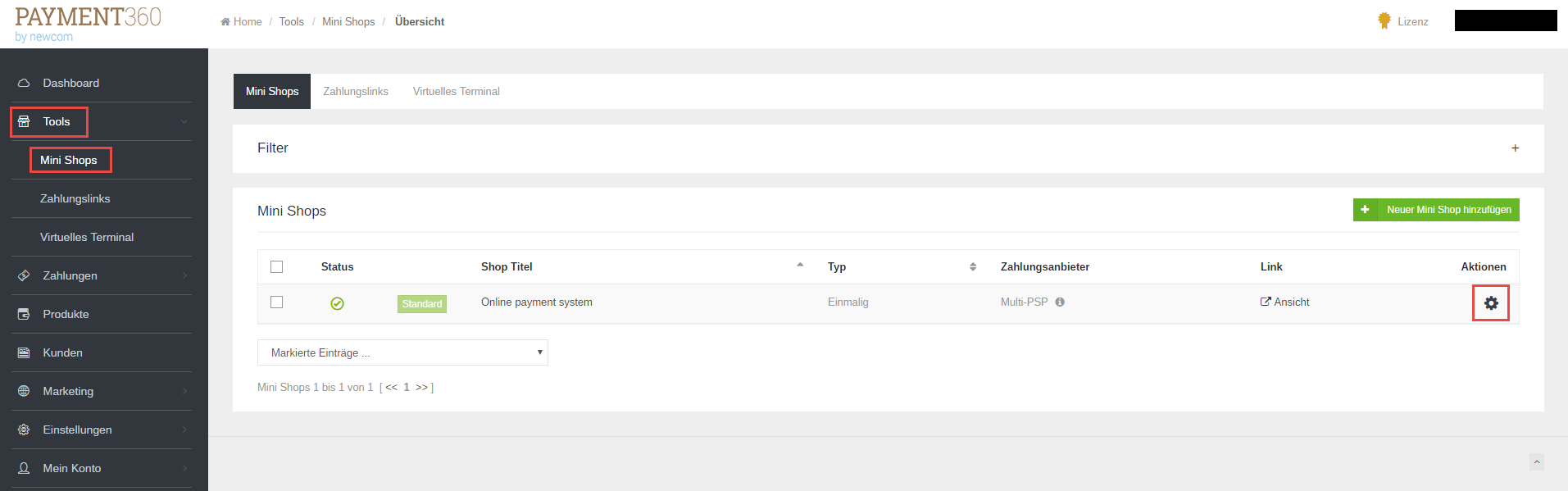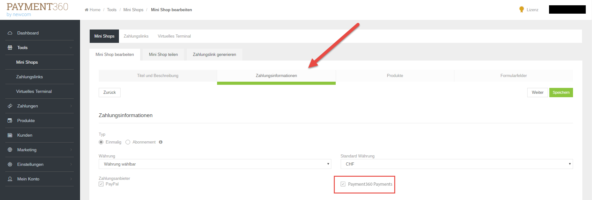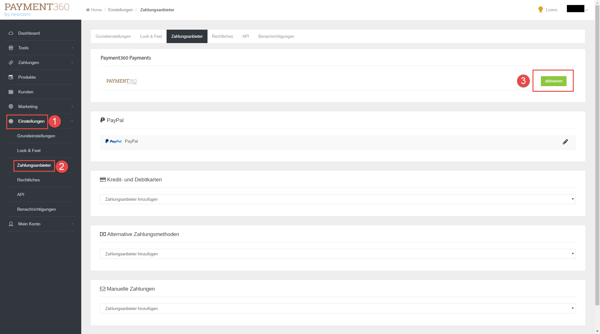 Jetzt anmelden und ganz einfach Payment360 Payments im Administrationsbereich aktivieren und sofort starten.