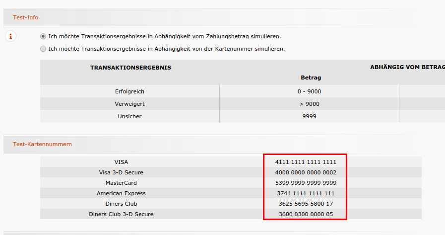 Mit folgenden Testkreditkarten (rot eingekreist) können Sie Testzahlungen mit den Anbindungen an Postfinance, ConCardis und Ogone durchführen. Die CVC und das Ablaufdatum können frei gewählt werden, wobei das Ablaufdatum in der Zukunft liegen muss.