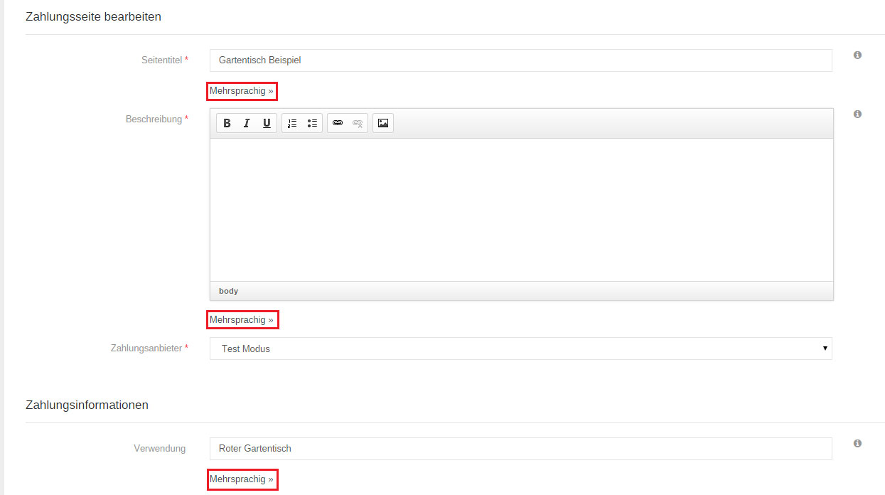 Beim Erstellen eines Zahlungsformular können Sie jeweils auswählen, welche Teile mehrsprachig sein sollen: