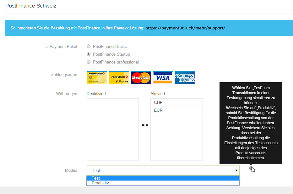 Hinweis: Falls Sie den Testmodus bei Payment360 Payments nicht auswählen können, versuchen Sie, Payment360 Payments zu deaktivieren und anschliessend zu re-aktivieren, das sollte den Fehler beheben.