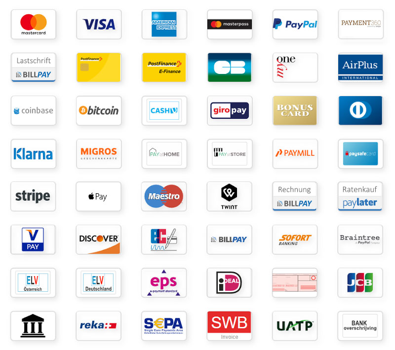 Auf dieser Abbildung sehen Sie die gängigsten Zahlungsmethoden, die Sie bei der Verwendung von Payment360 akzeptieren können: