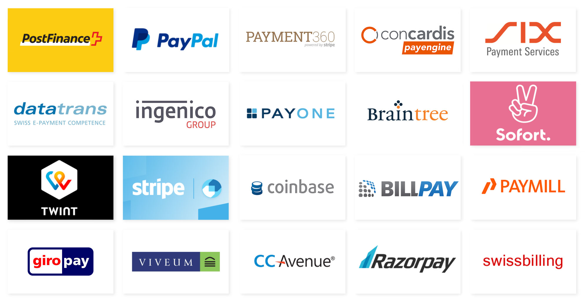 Die Zahlungsmethoden werden durch verschiedene Zahlungsanbieter unterstützt. Sie können meherere Zahlungsanbieter mit Ihrem Payment360 Account verknüpfen. In der folgenden Abbildung sehen Sie alle verfügbaren Zahlungsanbieter: