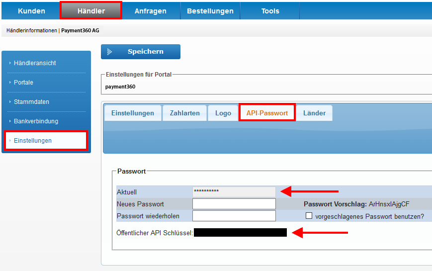 Den API-Schlüssel und den Sicherheitsschlüssel finden unter dem Menüpunkt “Einstellungen” und danach “API-Passwort”: