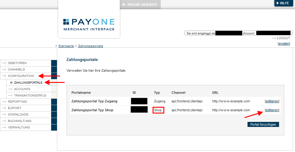 Konfiguration > Zahlungsportale anwählen. Anschliessend beim Zahlungportal vom Typ “Shop” auf “editieren” klicken: