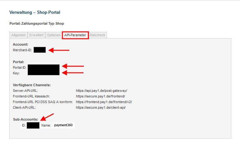 Unter dem Tab “API-Parameter” können die Felder Merchant-ID, Portal-ID, Key und Account-ID entnommen werden.