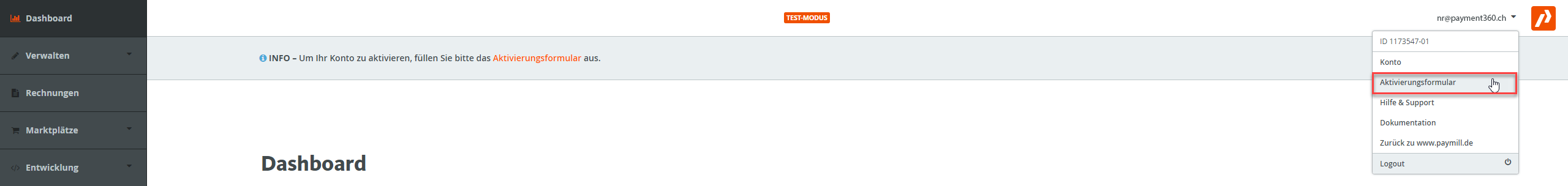 - Aktivieren Sie Ihr PAYMILL Test-Konto. Hierzu müssen Sie ein Aktivierungsformular ausfüllen, welches Sie über das Menü in Ihrem PAYMILL Konto erreichen: