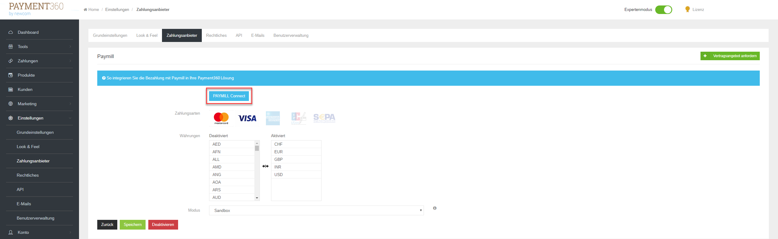 5. Verbinden Sie nun Payment360 mit PAYMILL mittels des Links “PAYMILL Connect”: