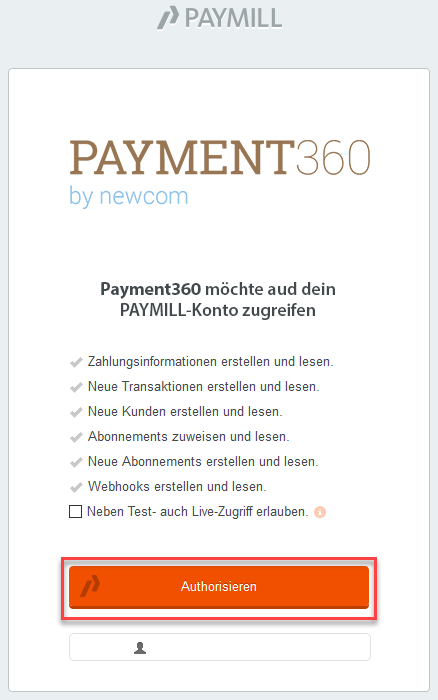 7. Wählen Sie “Authorisieren” und Ihr Payment360 Account ist nun mit PAYMILL verbunden.