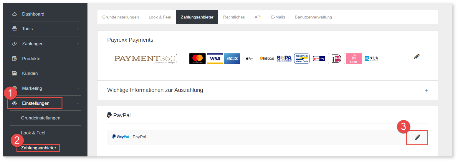 Wenn Sie Ihren Payment360 Account einrichten, wird automatisch PayPal als Zahlungsanbieter auf Ihrer Verkaufsseite angezeigt. Sobald jemand eine Zahlung mit PayPal tätigt, wird diese automatisch auf die bei Payment360 registrierte E-Mail Adresse überwiesen. Falls Sie bereits einen PayPal Account besitzen, jedoch mit einer anderen E-Mail Adresse als diejenige, mit der Sie sich bei Payment360 registriert haben, können Sie diese unter Einstellungen -> Zahlungsanbieter -> PayPal ändern: