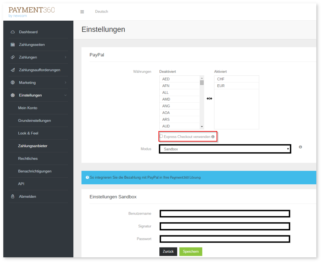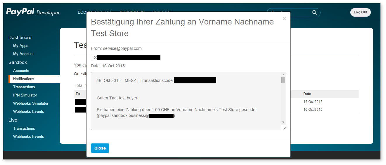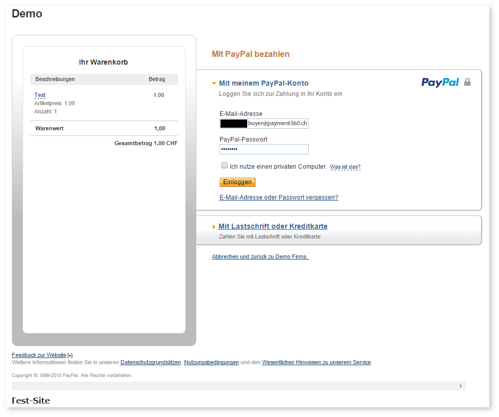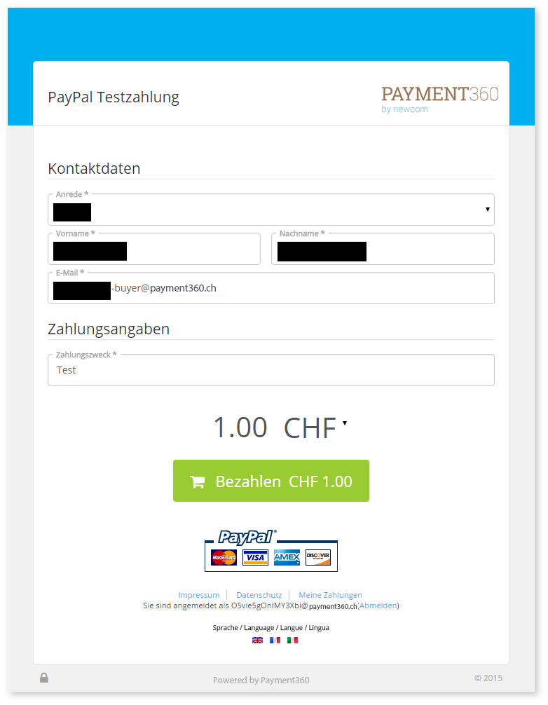 Nachdem Sie ein kostenloses PayPal-Geschäftskonto eröffnet und Ihre Zugangsdaten angefordert haben, können Sie einen PayPal Sandbox Account anlegen, um Testzahlungen mit Ihrem Payment360-Formular vorzunehmen.