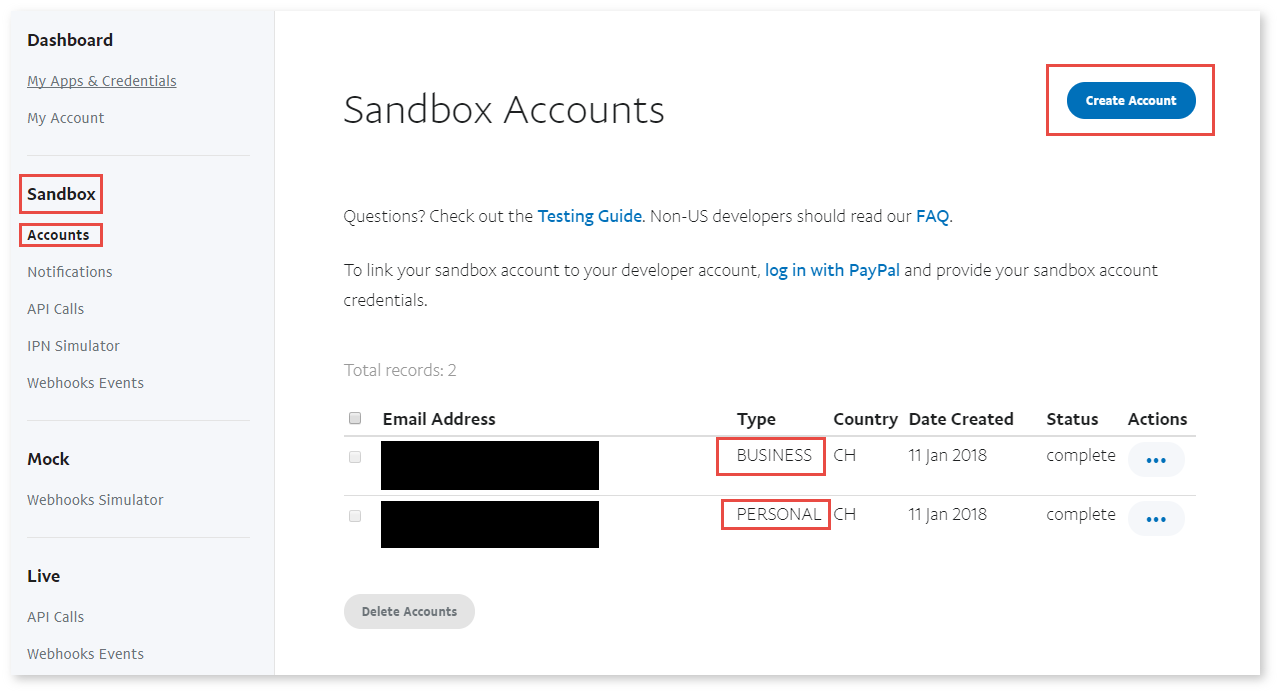 Melden Sie sich auf der PayPal Developer Website an. Erstellen Sie unter Sandbox > Accounts > Create Account einen Business Account (-facilitator@) sowie einen Personal Account (-buyer@).