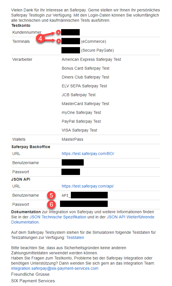 - Test API Passwort: JSON API Passwort (siehe E-Mail Saferpay Test Account)