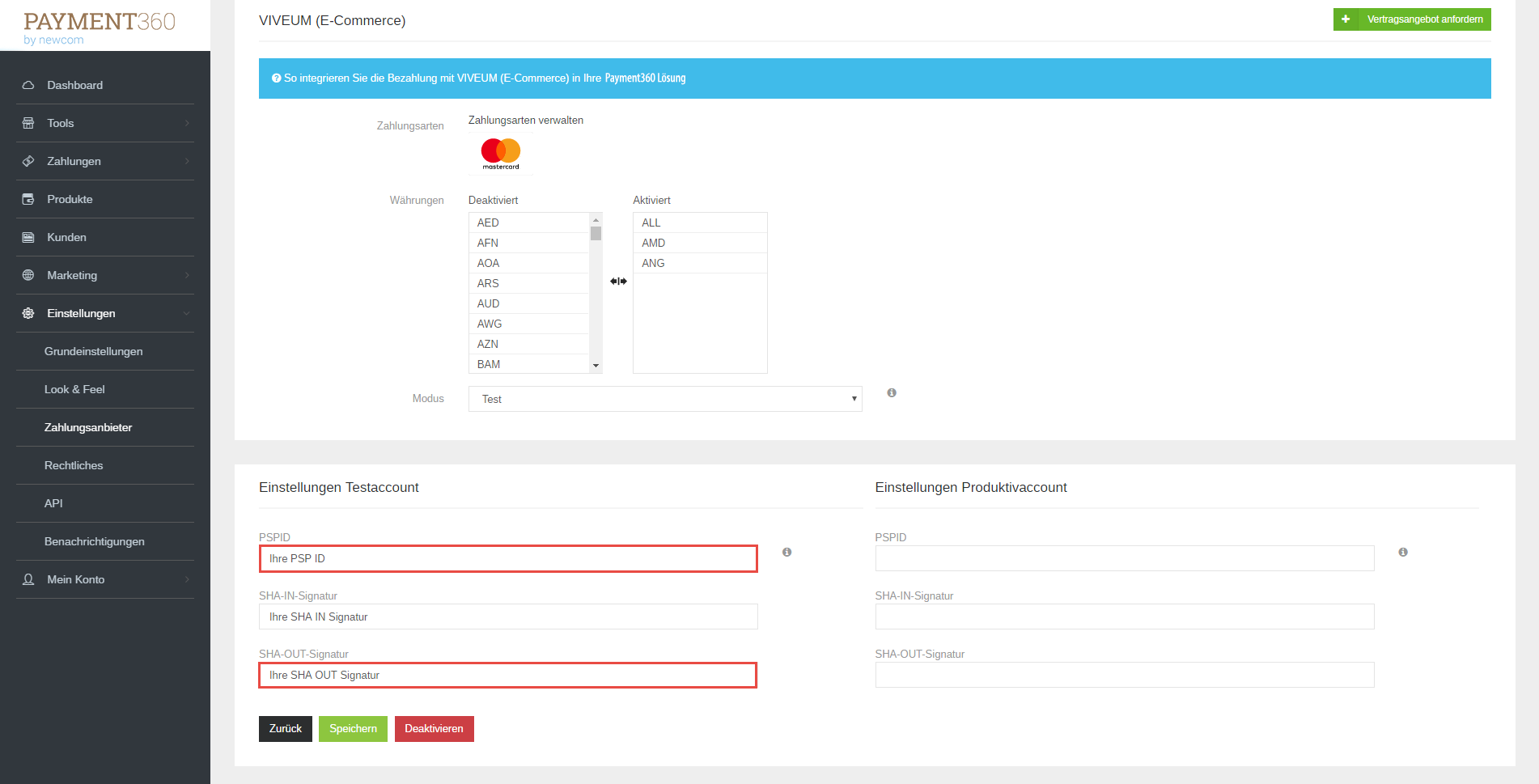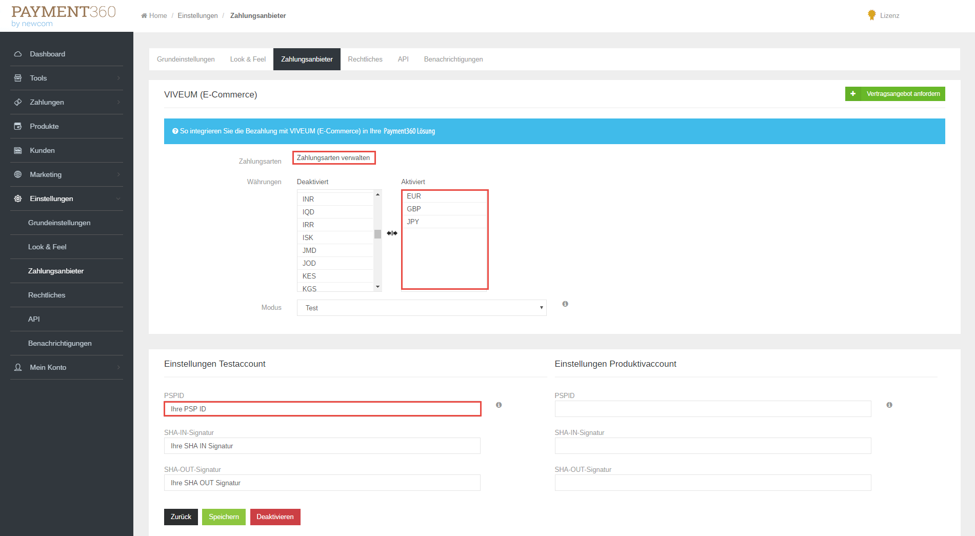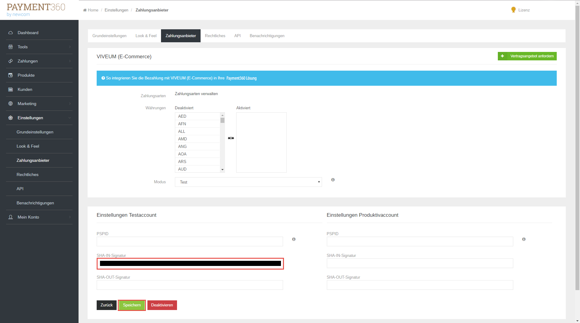 - Sie erhalten von Viveum eine E-Mail mit Ihren Zugangsdaten. Tragen Sie diese in die untenstehenden Eingabefelder unter Payment360 Testmodus ein. Wählen Sie dann das entsprechende Zahlungsarten sowie die aufgeschalteten Währungen aus. Klicken Sie «Speichern».