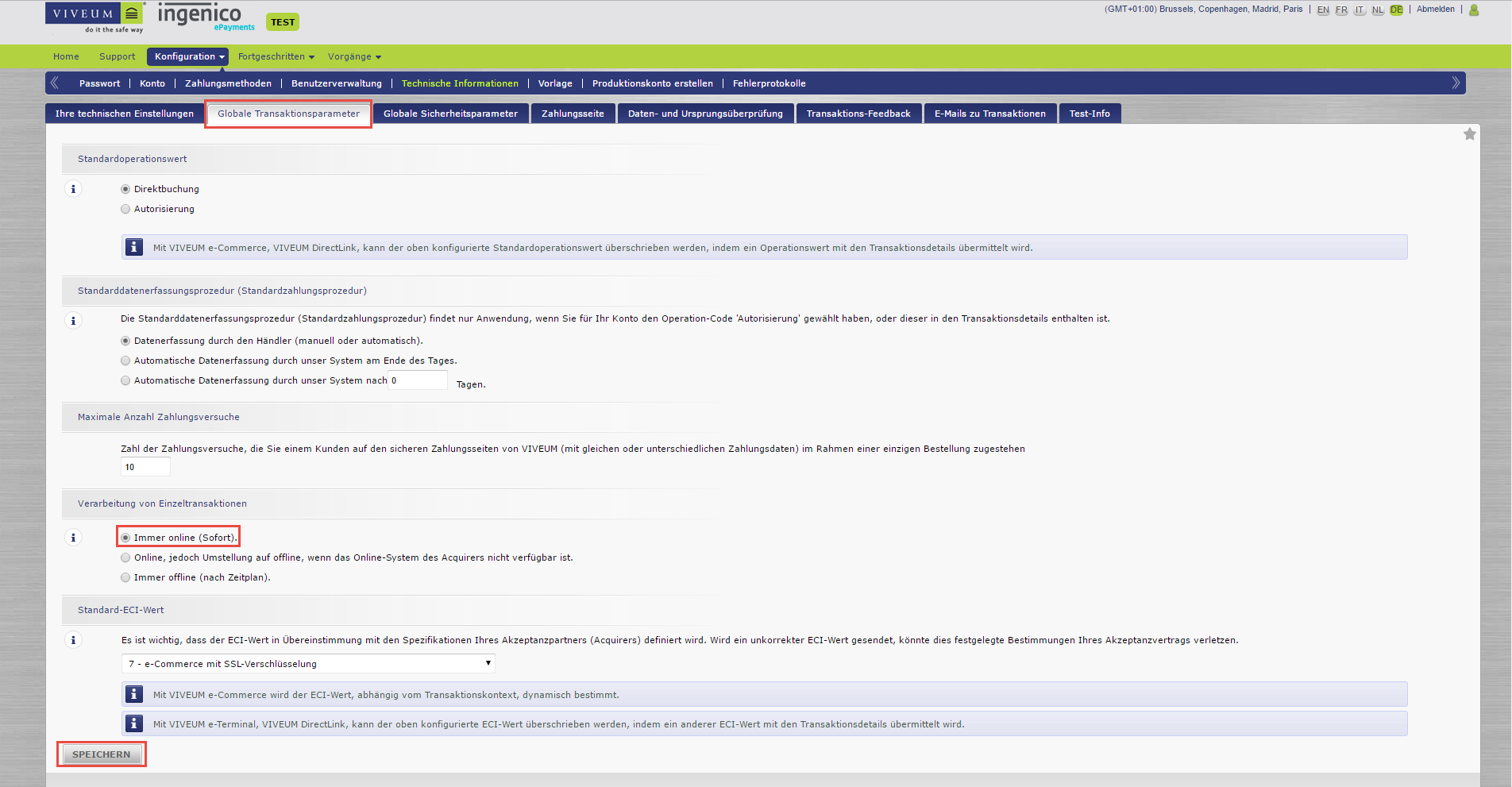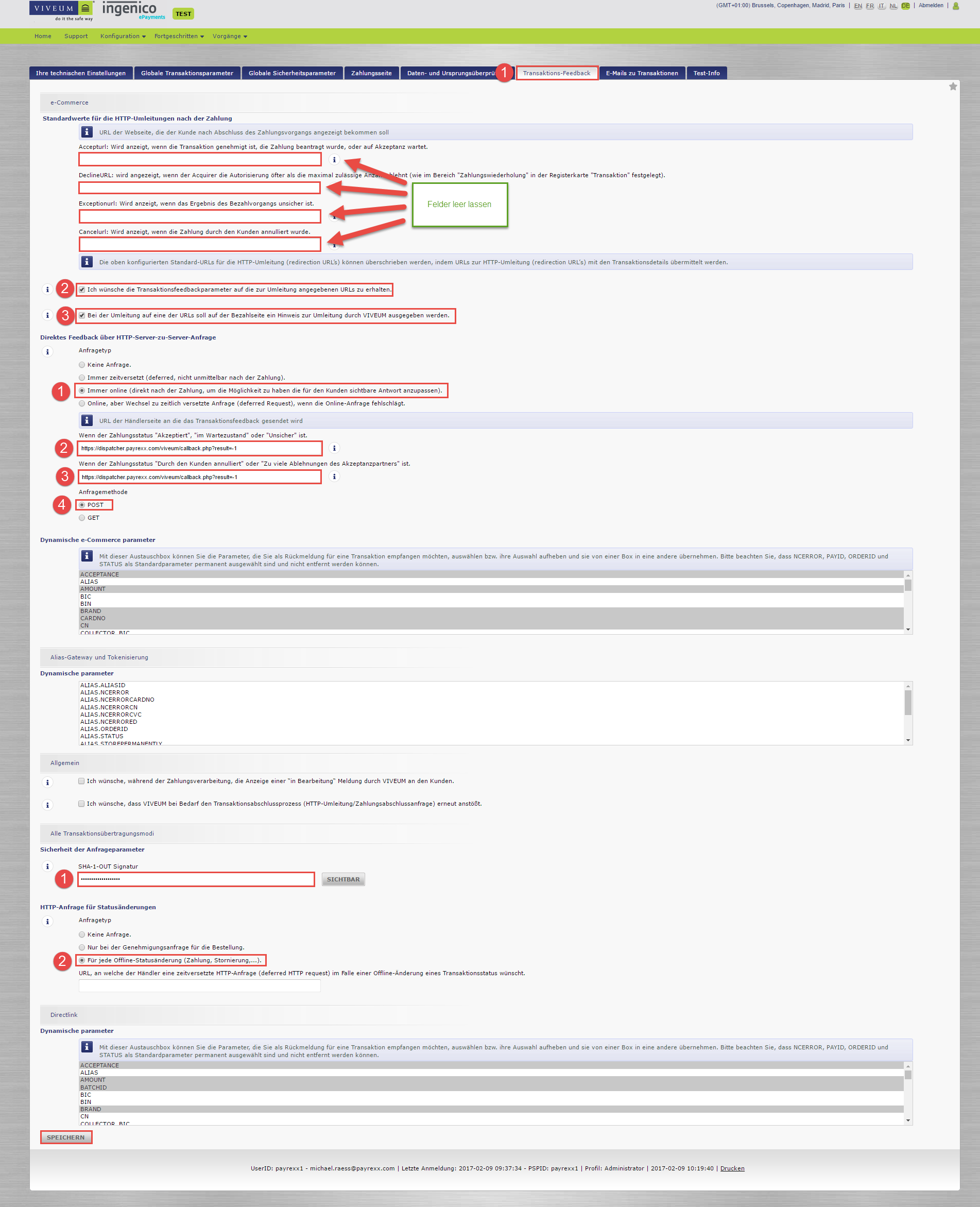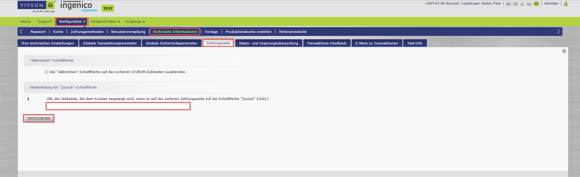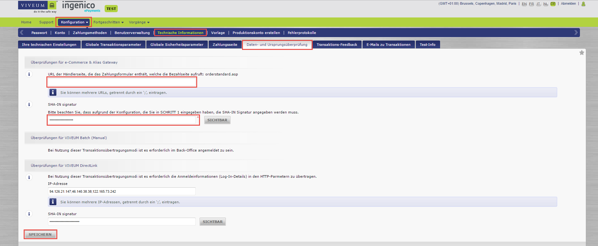 - Sie erhalten von Viveum eine E-Mail mit Ihren Zugangsdaten. Tragen Sie diese in die untenstehenden Eingabefelder unter Payment360 Testmodus ein. Wählen Sie dann das entsprechende Zahlungsarten sowie die aufgeschalteten Währungen aus. Klicken Sie «Speichern».